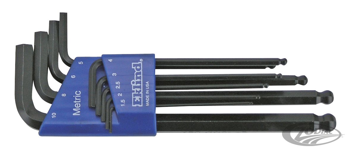 It is not without reason they say, "Good tools are half the job". We offer a complete line of USA made High Quality Allen head and Torx head keys, screw drivers and T-handle drivers made by Eklind, the world leader in manufacturing allen keys and similar. Each kit is manufactured of 8650 alloy steel for years of trouble free use. These professional quality tools are now available at very competitive prices. Since the introduction of the V-Rod, metric sizes have become a must in every Harley workshop too, that's why we now offer these kits in both metric and standard. The best for the custom builder and a must for the professional workshop. Ball end driver offers you an easy fastening in an up to 35 degree angle. Holder kits also available with extra short stubby end.