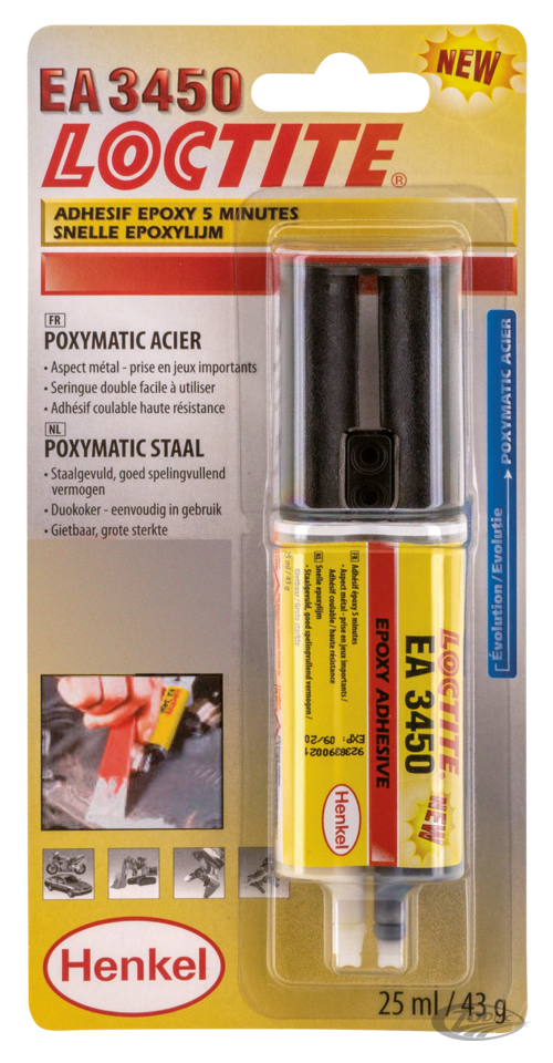Loctite EA 3450 is a grey, fast cure 2-component epoxy for structural bonding, ideal for metal repair. Has a working time of 4 to 6 minutes and a fixture time of 15 minutes. Service temperature range is from -55°C to over 100°C.