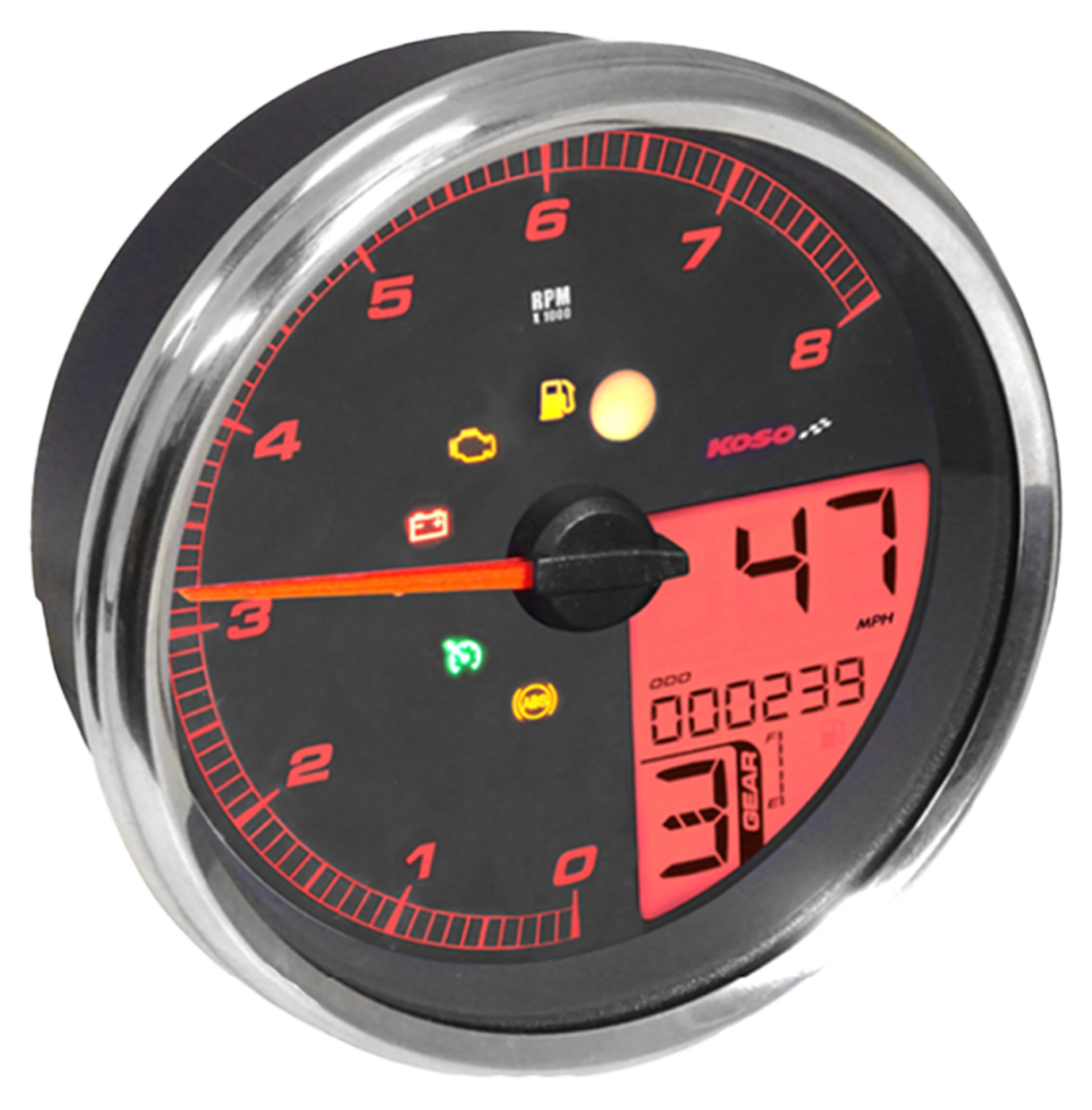 The HD-05 gauge fits Dyna, Softail and Road King with Fat Bob style tank mounted dash. It's a Plug-n-Play solution that combines speedometer and tachometer in one unit. This set connects directly to the existing wiring harness and interacts with the motorcycle’s system. It is especially suitable for models with a raised tank. Speedometer displays speed up to 360 km/h (225 MPH), odometer up to 999999 km/miles, trip meter A/B up to 9999.9 km/miles. Tachometer up to 8000 RPM, with built in rev limit/shift light adjustable from 2000-8000 RPM. Also features a l level fuel gauge, average fuel consumption, 12H/24H clock, voltmeter and selectable maintenance intervals. Comes with indicator lights for reserve, check engine, voltage, security, cruise control, ABS and RPM warning. Switchable backlight colors: red / orange / yellow / green / blue / indigo / purple / white.