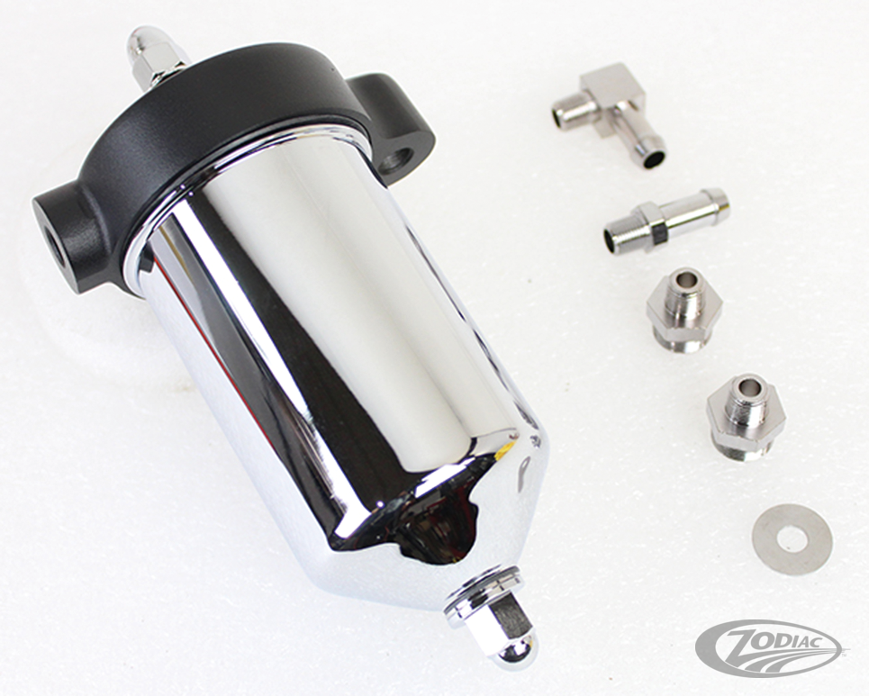 These filter kits feature barb style hose fittings which can be substituted with screw in fittings to accept OEM style metal lines. Fits 1940-1964 Big Twin. Year-specific mounting bracket must be ordered separately.