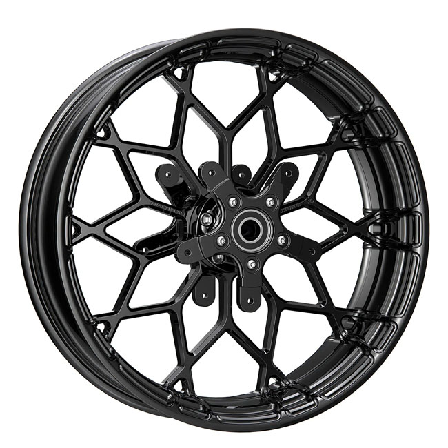 Note: Special Order Product only. To order please contact your MCS sales representative. - Black anodized finish - Ready to install wheel - Includes an installed Arlen Ness cartridge dual disc hub - Designed to style match H-D's Prodigy rear wheels found on 2020-up Special Touring / Bagger models - Constructed from radial forged 6061-T6 aluminum - Detailed CNC machining from the edge of the rim to the center of the wheel hub - Structurally tested to meet or exceed DOT; JAS and international load ratings - Smooth rolled rim lip with CNC machined details - Includes dual FLT rotor adapters; adapters accept factory spoke mounted 14-up FLT front rotors (both factory & - aftermarket