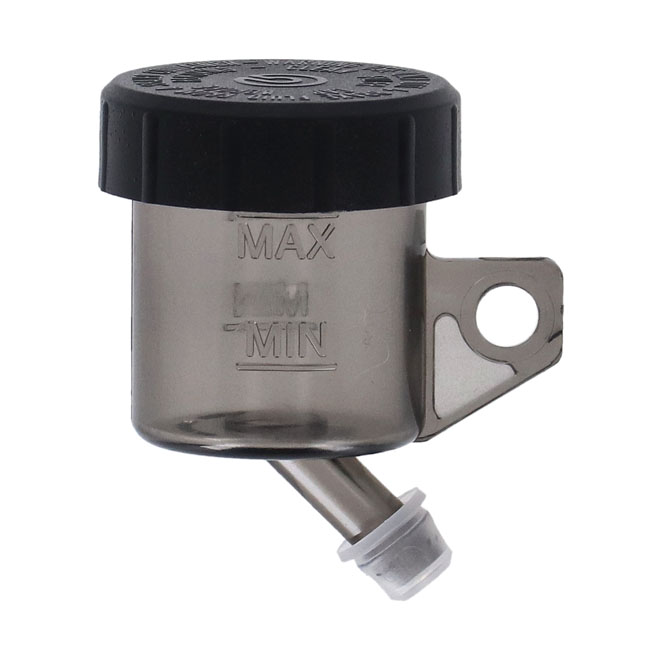 45° angled threaded hose mount. Translucent (see-through) reservoir for easy viewing of fluid level. Compatible with all DOT 4 brake and clutch fluids. For replacement & optional parts see: - 999208 Brake/Clutch fluid reservoir hose - 999210 Brake fluid reservoir protector sleeve - 999211 Clutch fluid reservoir protector sleeve. Note: Not compatible with DOT 5 brake fluids.