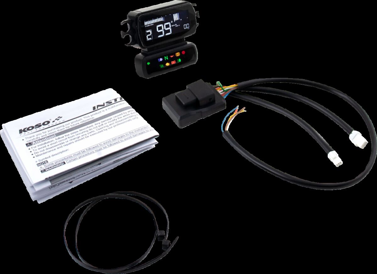 - Features a tachometer/speedometer combination with a programmable shift light and includes gear indicator.