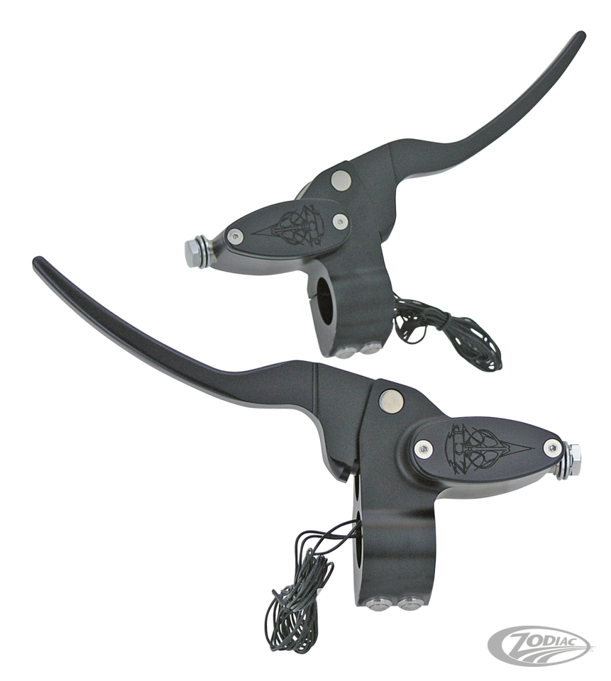 Nicht nur ein weiteres Custom Part, sondern ein hochwertiges Custom Lenkerarmaturen Kit. Es gibt natürlich jede Menge solcher Armaturen auf dem Markt aber keiner kann eine so hohe Qualität in Design und Finish so preiswert anbieten. CNC-gefertigt aus solidem Billet-Alu mit eingraviertem Tribal-Motiv auf dem Bremszylinderdeckel machen sich diese Armaturen auf jedem Custom Bike besonders gut. Diese Kits werden komplett mit Handbremszylinder, Kupplungshebel und -Aufnahme für Seilzüge oder Hydraulikleitung, sowie Drucktastern geliefert. Die Hydraulikzylinder besitzen beide eine Bohrung von 5/8" Durchmesser und eignen sich somit für die meisten Einscheiben und Doppelscheiben Bremsen. Die hydraulisch betätigten Kupplungszylinder besitzen einen Kolbendurchmesser von 9/16" und eignen sich für die gängigsten Hydro-Nehmenrzylinder. Kits sind erhältlich in polierter, schwarz-beschichteter oder verchromter Ausführung und ausschliesslich für DOT 4 Bremsflüssigkeit ausgelegt.
