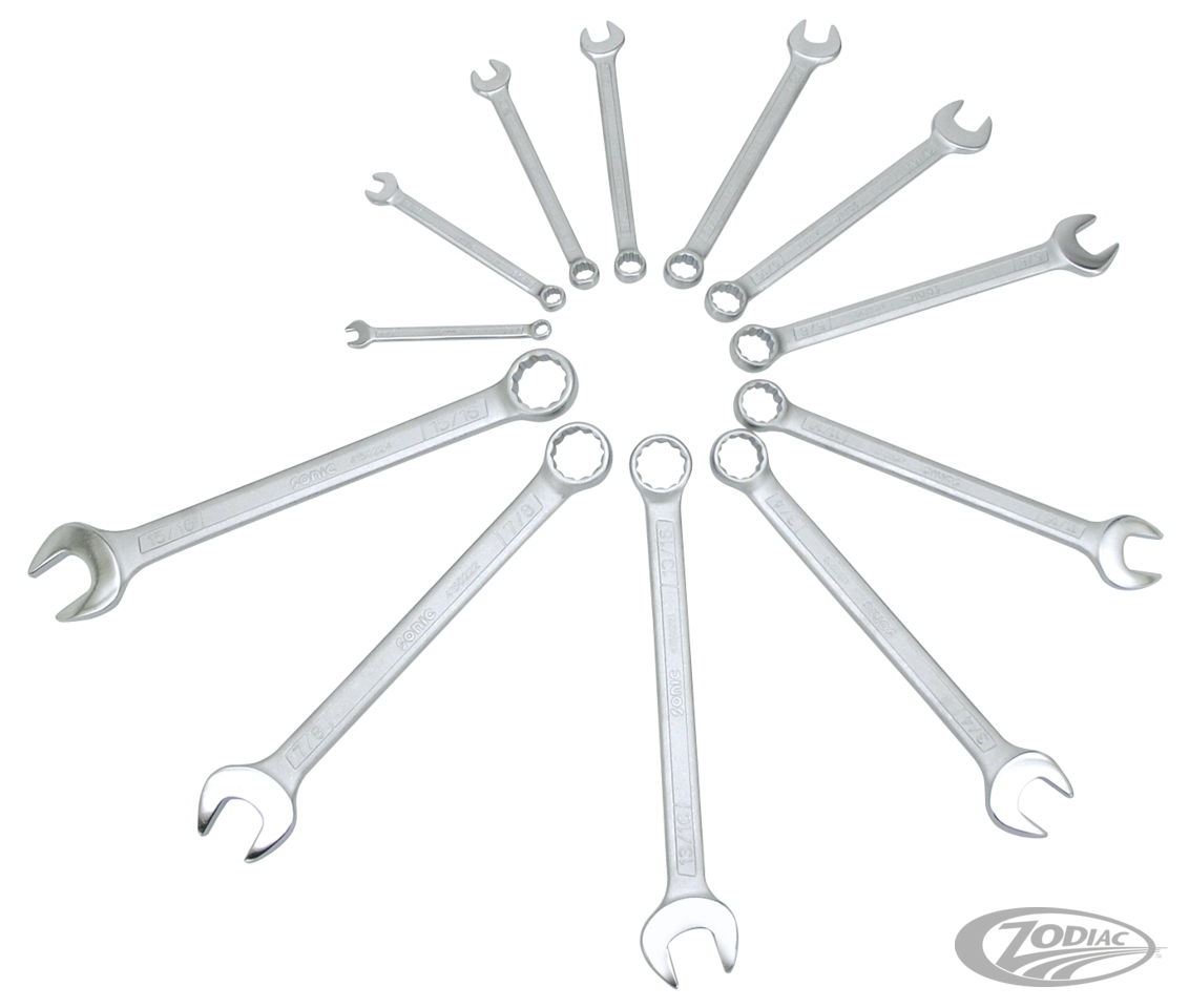 Gabel-Ringschlüsselsatz, 12-teilig, (SAE); 1/4", 5/16", 3/8", 7/16", 1/2", 9/16", 5/8", 11/16", 3/4", 13/16", 7/8" & 15/16" matt verchromt