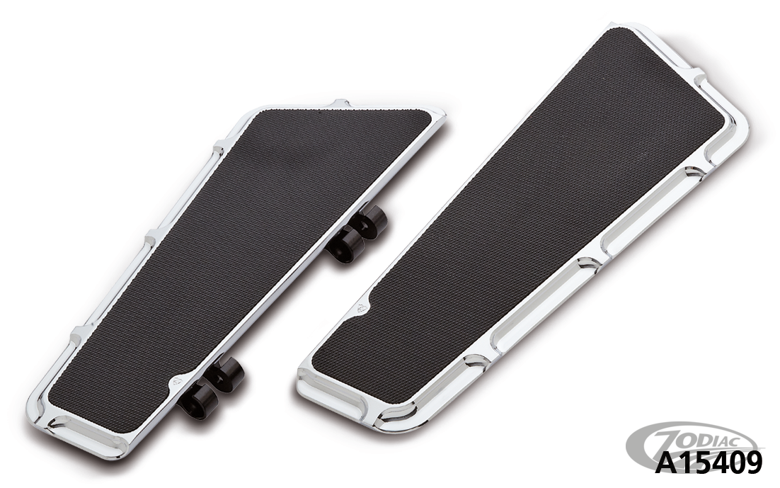 Fahrer-Trittbretter-Sets für: •Tourer ab 1980 (außer FLHTCUL, FLHTKL & FLHTCUL-TC) •Trikes ab 2009 •FL Softail-Modelle von 1986-2017 •FLD Switchback 2012-2016, Beveled, verchromt