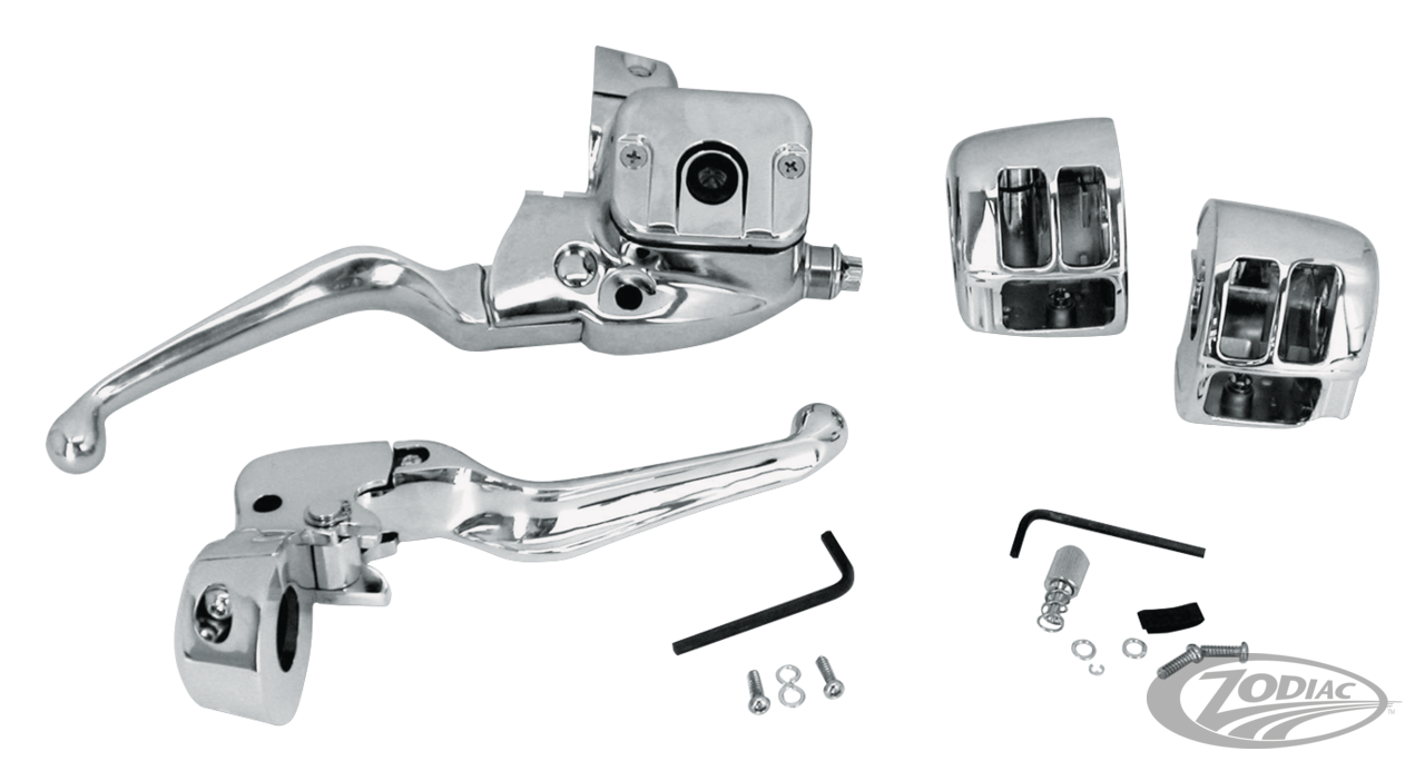 Hochglanzverchromte Custom Lenkerarmaturen Kits die von den OEM Armaturen der Big Twin und Sportster Modelle ab 1996 abgeleitet wurden. Kits beinhalten die komplette Bremsarmatur mit Hebel, den Kupplungshebel mit Gelenk, Schaltergehäuse links und rechts, sowie das erforderliche Befestigungsmaterial. Zur Auswahl stehen Bremszylinder mit 9/16" und 5/8" Bohrung für eine Bremsscheibe sowie ein Bremszylinder mit 11/16" Bohrung für Doppelscheibe. Die Schaltergehäuse sind genaue Replikas der OEM Gehäuse, jedoch im perfekten Chromfinish und geeignet für die OEM Schalter oder vergleichbare Zubehör-Schalter der Sportster Modelle ab 1996 und Softail/Dyna Modelle von 1996-2006.