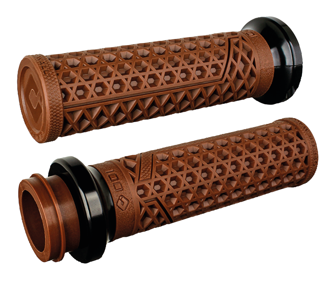Für elektronischem "Throttle-By-Wire" ausgestattet Helix Softail ab 2025, 121CI CVO Touring ab 2023 & 117CI Touring ab 2024, Braune Griffgummis mit schwarzer Klemmung Vans Cult Lock-On Griffe, Paar