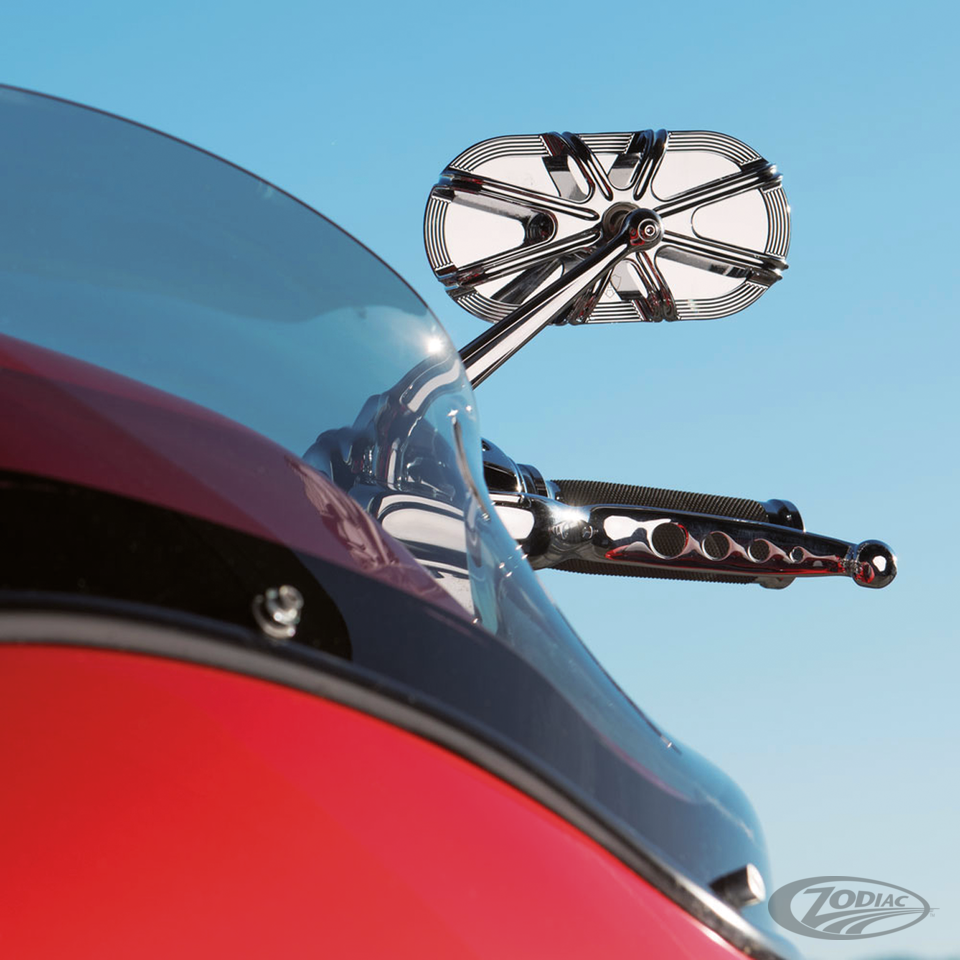 Leichtgewichtiges Multi-Piece Design aus geschmiedetem Alu und Spiegelköpfen mit den Abmessungen in 5.45"x2.5" und VA-Spiegelgelenk. Werden einzeln angeboten.