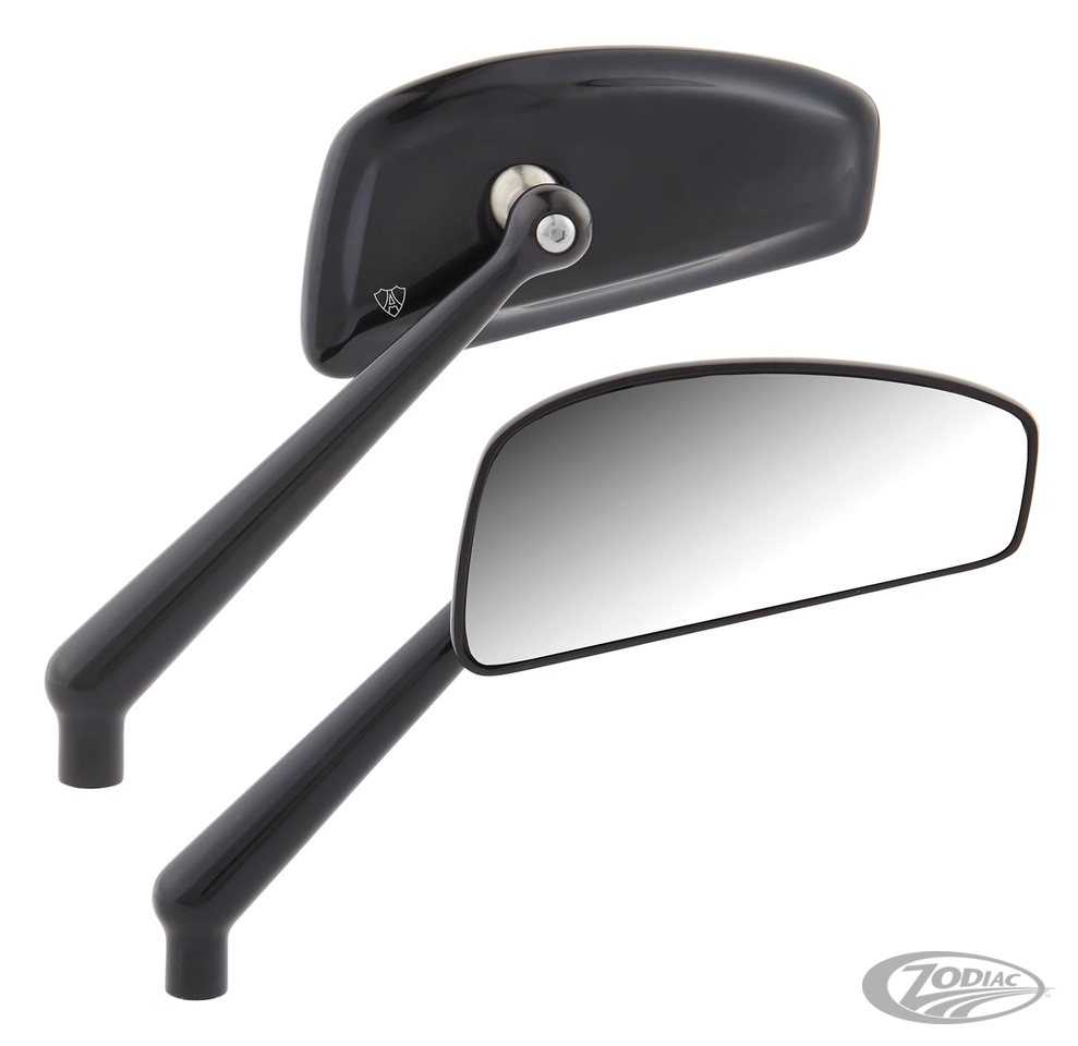 Eine neue Interpretation der klassischen Tropfenform. Die glatten Gehäuseformen und die abgewinkelte Außenform schaffen einen Spiegel, der zu jedem Stil passt. Spiegel, Kopf und Arm sind aus Billet Aluminium geschmiedet. Die Spiegel verfügen über robuste interne Drehbeschläge aus Edelstahl und werden sowohl mit SAE als auch mit metrischen Befestigungsteilen für den Einsatz auf amerikanischen und allen anderen Motorrädern geliefert.