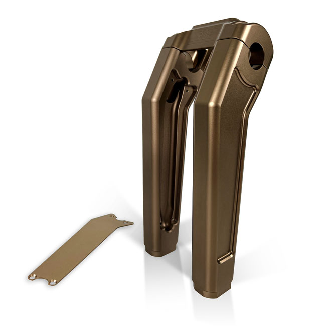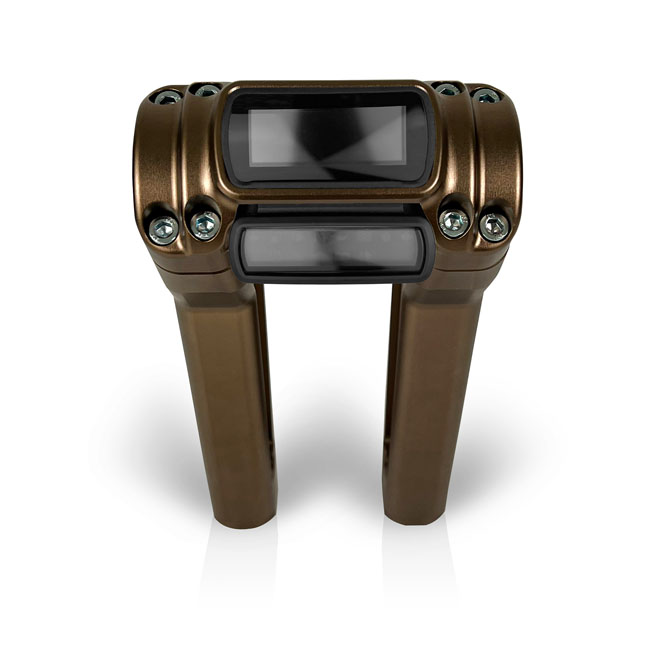 For H-D digital Speedo. Billet aluminum 7" risers with a 1" (25.4mm) handlebar clamping area. Compatible with all bikes with the H-D 3.5" center to center mount holes. The HeinzBikes cable cover offers invisible internal wiring routing. A new installation experience and sets new standards in innovative and concealed internal wiring. Wires can be routed from the top (up to 3.5" width) through the upper and lower cable management; and then easily closed and screwed in place with the cable cover.- 30 degrees Pullback - Glass bead-blasted black pearl anodized bronze- Extreme stability and torsion rigidity - Lockable cable cover: innovative; invisible internal wiring - Easy cable & wiring routing - Ultra clean look
