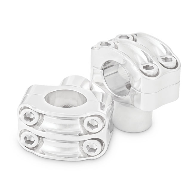 CNC billet aluminum construction. For handlebars with a 1" (25.4mm) clamping diameter. With a two-piece 8-bolt clamping system (8 bolts for 2 risers). Designed to provide additional clamping force to help prevent handlebars rotating in the risers. This additional 'torque resistance' is especially useful with higher handlebars. 12-13 threaded. With a low 1.5" (3.8cm) rise and designed to give ultimate strength. Complete with stainless top clamp bolts.