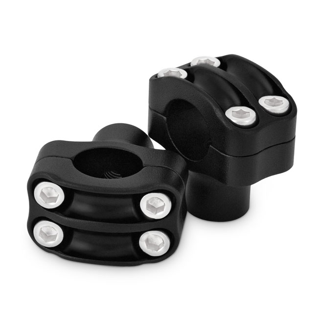 CNC billet aluminum construction. For handlebars with a 1" (25.4mm) clamping diameter. With a two-piece 8-bolt clamping system (8 bolts for 2 risers). Designed to provide additional clamping force to help prevent handlebars rotating in the risers. This additional 'torque resistance' is especially useful with higher handlebars. 12-13 threaded. With a low 1.5" (3.8cm) rise and designed to give ultimate strength. Complete with stainless top clamp bolts.