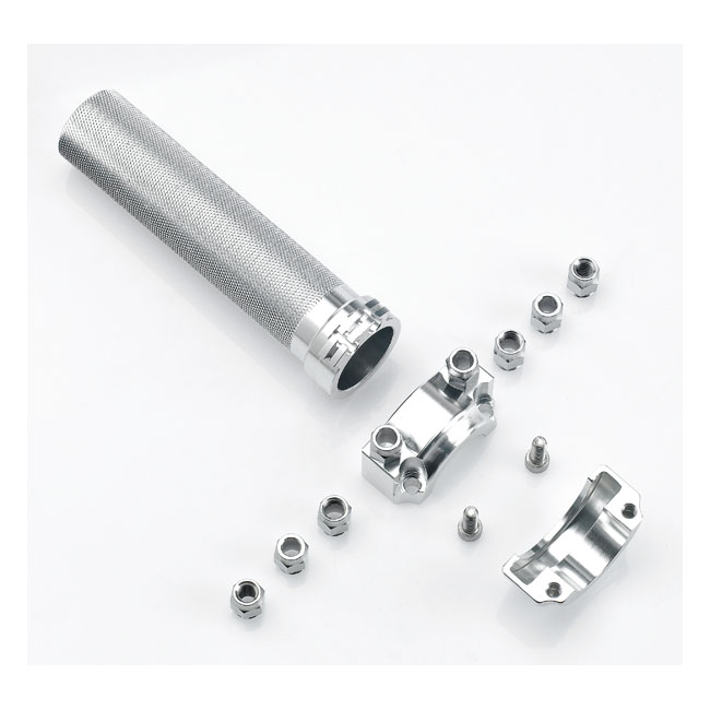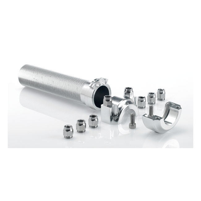 For 1" handlebars. CNC machined alloy throttle sleeve with investment cast aluminum clamp. Incl. two sets of four cable ferrules to fit universal and stock 74-95 screw; 81-95 screw & 96-up circlip design H-D applications and custom cables in a single or dual cable set-up in combination with 1" diameter handlebars. Will take stock style H-D throttle grips. Note: Biltwell advises these throttle grips to be installed by a qualified mechanic.