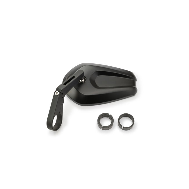 - For left or right side use - With a short aluminum angle adjustable clamp-on stem and ABS mirror head - Fits 30mm handlebars and includes 2 aluminum clamp inserts to allow installation on 1" (25.4mm) and 22mm diameter handlebars - With an ABS mirror head and aluminum stem - EC approved