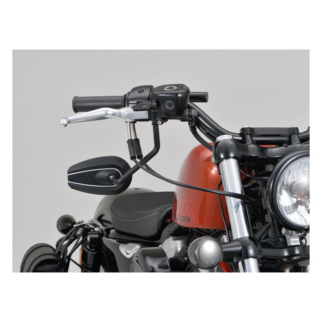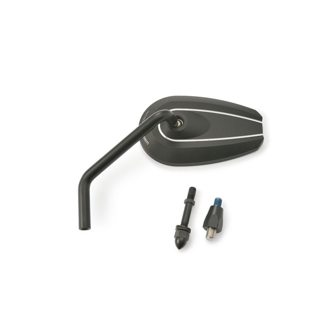 Daytona, D-mirror. Number 6 (left side use)- Mounts to the handlebar mirror mount hole - For left side use - Includes M10xP1.25 bolts: 1x right hand thread and 1 x Harley adapter - Aluminum mirror head; steel stem - EC approved