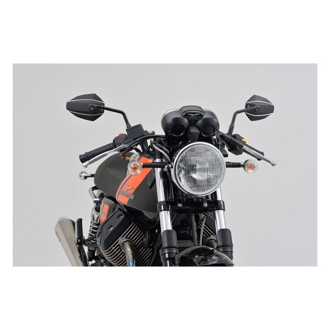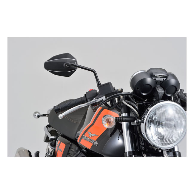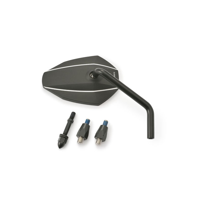 - Mounts to the handlebar mirror mount hole - For right side use - Includes M10xP1.25 bolts: 1x left hand thread (for Yamaha); 1x right hand thread and 1 x Harley adapter - Aluminum mirror head; steel stem - EC approved