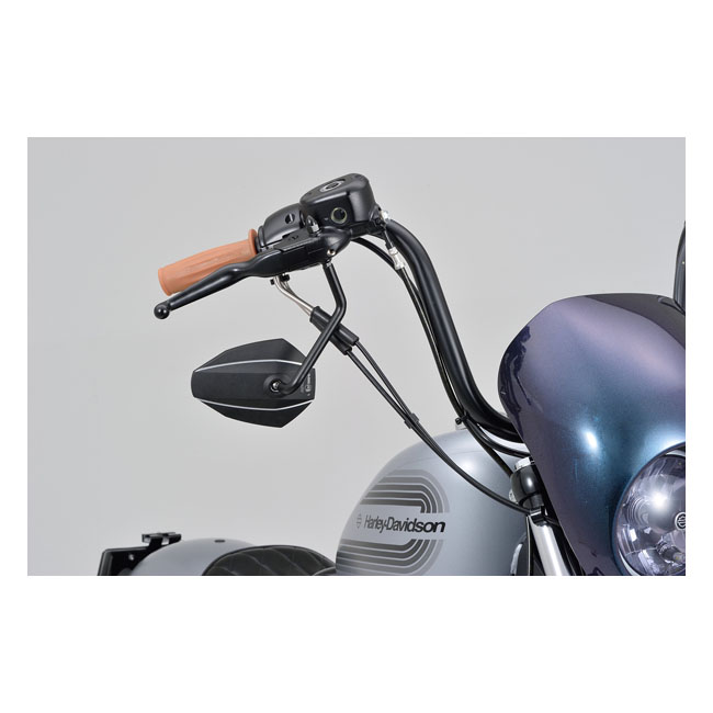 Daytona, D-mirror. Number 7 (left side use)- Mounts to the handlebar mirror mount hole - For left side use - Includes M10xP1.25 bolts: 1x right hand thread and 1 x Harley adapter - Aluminum mirror head; steel stem - EC approved