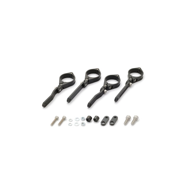 For 41mm diameter fork tubes. Black anodized CNC machined aluminium construction. These brackets have two clamps that can slide up and down the fork tube. By sliding both you can move your headlamp up and down; by sliding only one you can position the headlamp further in or out. Complete with turn signal mount kit for M8 threaded turn signals.