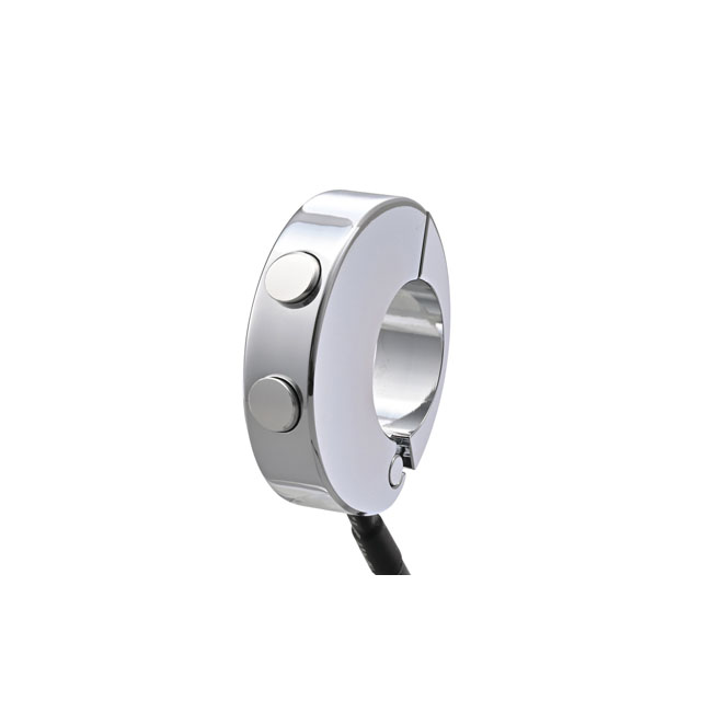 Perfect to operate speedometers or anything else where momentary push button switches are required. Note: Use for operating speedometers and other components up to 50mA current; other applications require a relay; like Daytona 701157 multiple-function relay. - CNC machined aluminum housing & buttons - Chrome plated - With 2 momentary switches - For 22mm and 1" diameter handlebars - Max. current capacity 50mA - Relays must be used for +50mA current - Width 12mm - Wiring outside or inside handlebar possible - Perfect for use with Velona speedometers and others