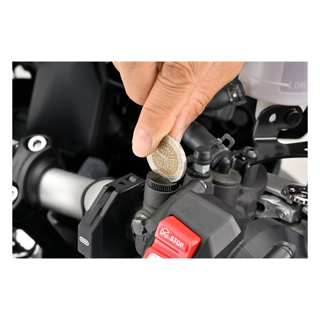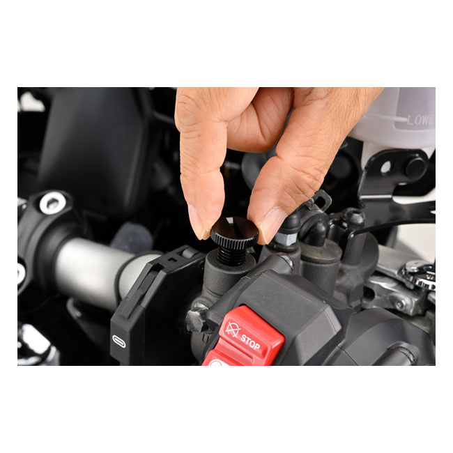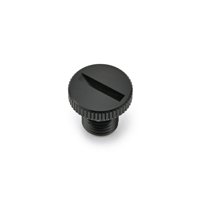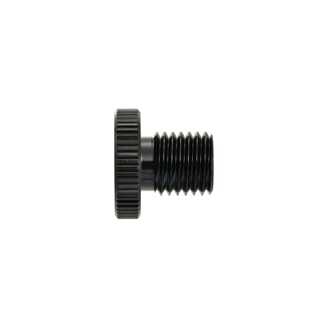 Daytona, mirror hole plug. Black. LHTM10 x 1.25 LHT / Left Hand Threaded (counter clock wise tightening). - Used to plug the hole in the handlebar clamp when the mirror is removed - Aluminum - Anodized finish