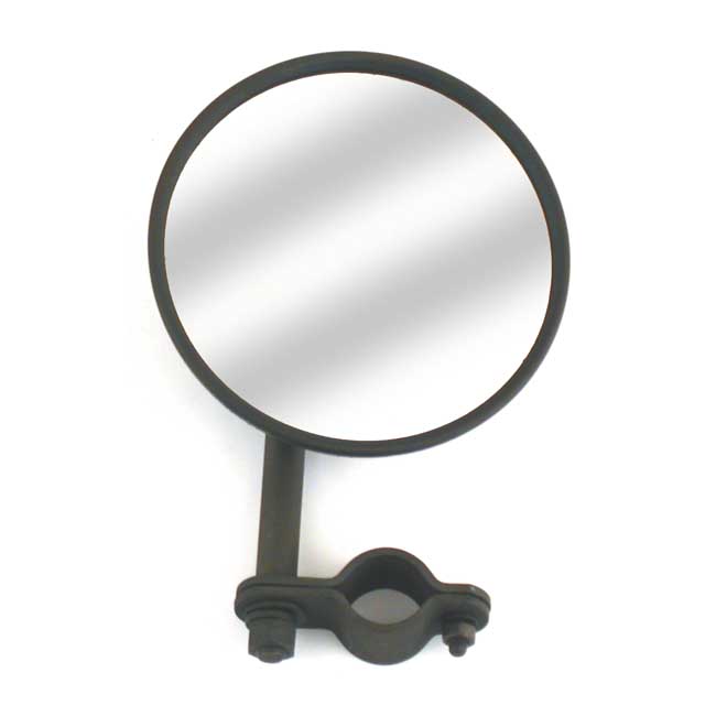 Gloss black painted with a black parkerized stem. Fully adjustable early style reproduction mirror. 5" diameter mirror head. Fits 1" (25.4mm) diameter handlebars. Replacement for OEM 33350-34.