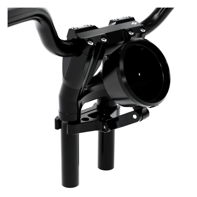 Hand position height from the top of the stock triple tree with 10" (25.4cm) black anodized Kickback Isolated risers with Fly Bars = 12.5" (31.8cm) total. Note: This kit will require longer brake/clutch lines and wire extension. This S-One black anodized billet aluminum S triple tree kit for the Lowrider S complements the attitude of your bike while getting you in a more upright riding position. Additionally; this setup drastically reduces the amount of unwanted leverage being placed on your bike's bushings while providing a much more solid bar feel. A great handling bike starts with ergonomics and body position. No matter how fast your bike is or how well it brakes; you don't have real performance if you don't have comfortable control over your machine. Kit includes: - 1-1/8" (28.6mm) FM Fly Moto Style Handlebar. Black - Lowrider S Gauge Bucket. With 1.25" (31.8mm) T-Bar clamp & 3" (76mm) extension. Black anodized - Bolts directly to the stock top triple tree Optional parts: - 948611 Pro-Line Perch Half Clamps. Black anodized - 984621 FXST Speedo & Instrument Harness. Used to extend your harness to 32" - (81.3cm) long. Plug & Play