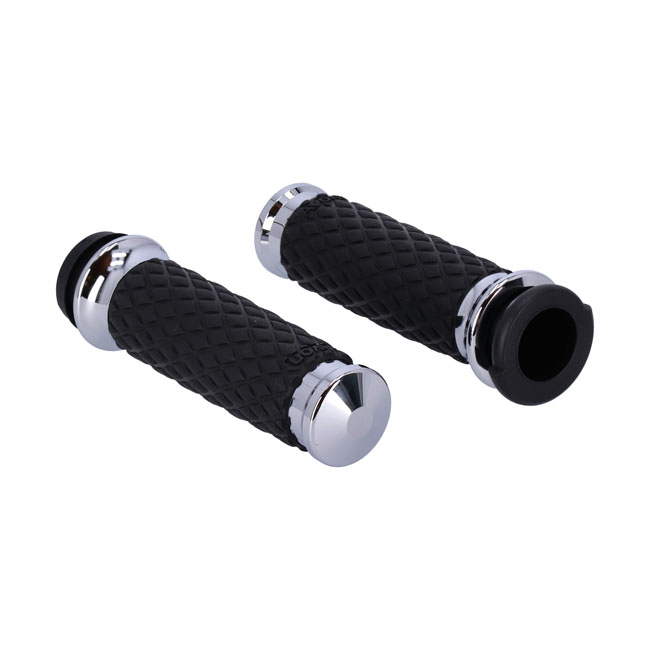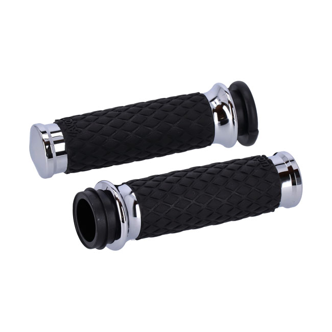 Chrome plated end caps and collars. For 1" diameter handlebars. Length 11.7cm. Includes throttle sleeve. Similar to the Avon air cushioned grips; the Air-SS incorporates a system of air pockets inside the grip to dampen vibration; but Air-SS grip does not have any surface bumps but a consistent surface diameter. Complete with an grip-enhancing knurled 'Diamond' texture with 6061 billet aluminum end caps and collars.