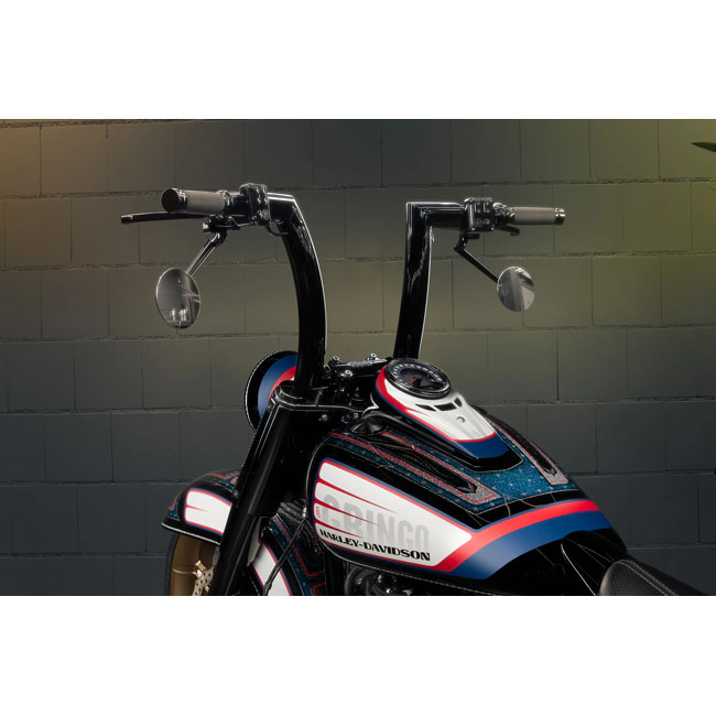 With a massive 2" outside diameter. For models with 1" handlebar clamp diameter and 1" handlebar grip diameter. The bolder; narrower alternative to the 'Killer Bull' handlebars; giving a more aggressive stance. Designed for the ultimate blend of style and comfort. Integrates seamlessly with 1" risers and both throttle cables and e-throttle (throttle by wire) setups. - 2" (50mm) outside diameter - Stock 1" (25.4mm) handlebar clamp diameter - Stock 1" (25.4mm) mm grip diameter - W32 5/8"; H 10"; PB 4.75"- Throttle cable and e-throttle compatible - 5 laser cut wiring holes - Gloss black powder coated steel / stainless steel Note: Not compatible with hydraulic clutch master cylinders. Note: Not compatible with 23-up Gen2 models with throttle sensor in switch housing. Note: With approval. Check your local MCS dealer or the MCS sales department for exact type of approval and validity on bike model and years on the test report.