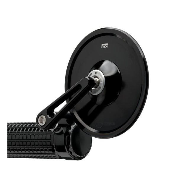 High quality glassless ECE marked bar end mirror that installs to both 22mm and 1" diameter handlebars. Adjusts in 3 sturdy locking intervals of 45°; from up; half way to side ways. It allows upside down mounting for a 'below bar' stance and allows left or right side use. It is CNC machined aluminum with an anodized finished; but a regular glass lens is not used. Instead the patented mirror surface is convex cut directly from the aluminum. This is done with ultra-precision diamond tools using a special ´fly-cutting´ procedure after which it is made corrosion and scratch resistant by a special vacuum plasma coating process. The aluminum itself is the mirror surface! Note: See optional in-bar handlebar adapters 575352 (mirror only) or 994295 (mirror + mo.view turn signal). - For left or right side use - Round mirror body: 99mm diameter- Thin mirror body: 4.2mm - Length of the mirror arm: 72mm - Fits 7/8" (22mm) and 1" (25.4mm) handlebars - Clamp width: 12mm - Without glass lens - Easy cleaning: Use a mild cleaning agent and a microfiber cloth. Avoid abrasive cleaning agents that could damage the surface- ECE marked - Stainless hardware - Weight: 150 gram