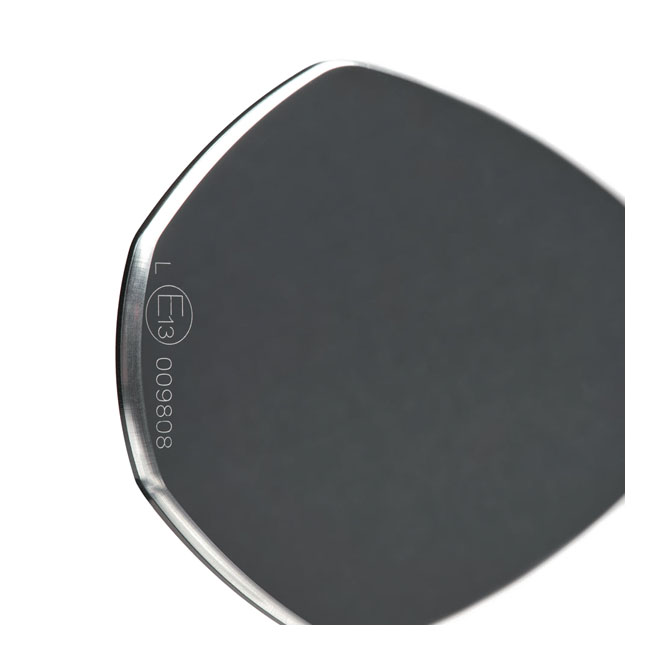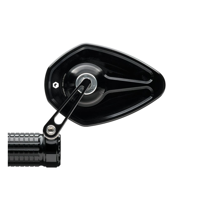 High quality glassless ECE marked bar end mirror that installs to both 22mm and 1" diameter handlebars. Adjusts in 3 sturdy locking intervals of 45°; from up; half way to side ways. It allows upside down mounting for a 'below bar' stance and allows left or right side use. It is CNC machined aluminum with an anodized finished; but a regular glass lens is not used. Instead the patented mirror surface is convex cut directly from the aluminum. This is done with ultra-precision diamond tools using a special ´fly-cutting´ procedure after which it is made corrosion and scratch resistant by a special vacuum plasma coating process. The aluminum itself is the mirror surface! Note: See optional in-bar handlebar adapters 575352 (mirror only) or 994295 (mirror + mo.view turn signal). - For left or right side use - 'Teardrop' mirror body: 83mm high x 122mm wide- Thin mirror body: 4.2mm - Length of the mirror arm: 72mm - Fits 7/8" (22mm) and 1" (25.4mm) handlebars - Clamp width: 12mm - Without glass lens - Easy cleaning: Use a mild cleaning agent and a microfiber cloth. Avoid abrasive cleaning agents that could damage the surface- ECE marked - Stainless hardware - Weight: 128 gram