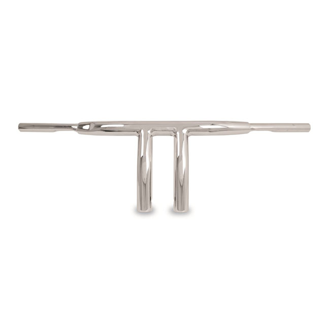 Classic T-bar styling. With 1-1/4" (32mm) oversized tubing that tapers smoothly towards the 1" (25.4mm) diameter for the handlebar controls. Wires can be run internally trough pre-drilled slots or externally at the dimples. Dimensions: 7" (18cm) rise x 29.70" (75.4cm) wide x 16" (40.6cm) center width x 7" (17.8cm) end rise x 7.5" (19cm) pullback.