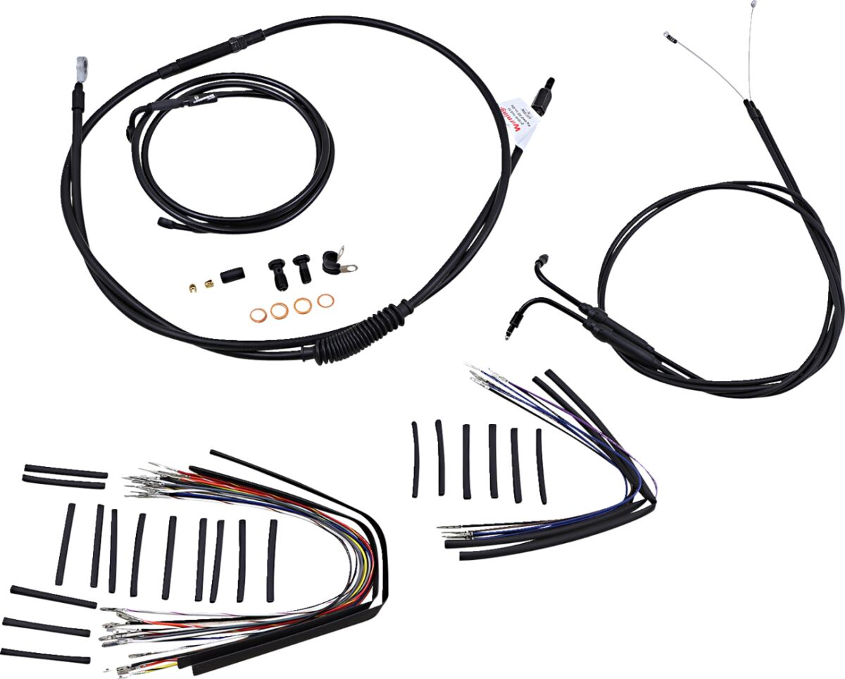 - Kit basiert auf der Verwendung von 2-Risers mit Ape-Hanger-Lenkern.Enthält verlängerte, schwarze, geflochtene Stahl-Bremsleitung für Einzelscheibe, verlängertes Kupplungsseil, verlängerte Gaszüge und alle notwendigen Kabel."