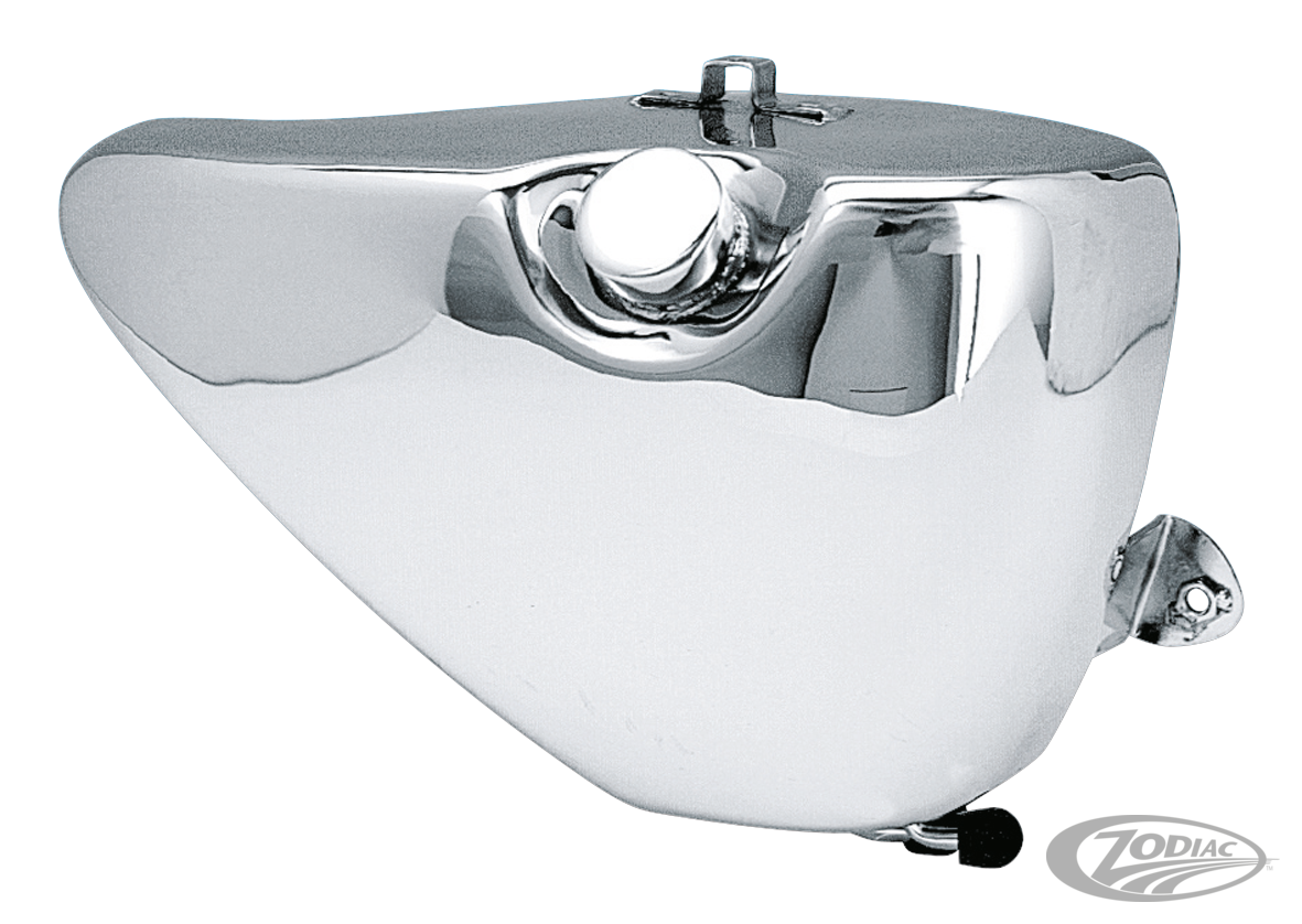 Super looking oil tank that adds a bright splash of chrome to the right side of all 1983 thru 2003 Sportster models. Replaces the original equipment part and matches perfectly with our battery and ignition module covers. On 1983 thru 1993 models the stock filler cap can be used, the oil tank for 1994 thru 2003 models comes complete with filler cap.