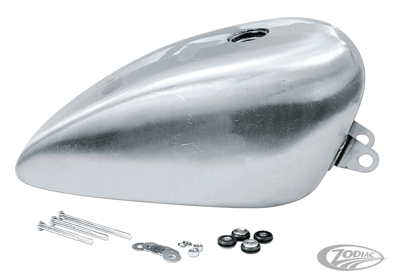 This tank has it all, the classic Peanut profile with the latest style rolled edges and increased fuel capacity for the extra miles. Holds approx. 3.4 gallon (12,9L.). Perfect for crash repairs or updating older models. Tanks come complete with mounting hardware and rubber grommets. Available for use with OEM or aftermarket Screw-In gas cap. For those who want something else we also supply these tanks with various Custom gas caps, such as a chrome plated and lockable aluminum Aero-style gas cap, or Pop-up style gas cap in a paintable finish. Except for Screw-In type tanks, gas cap(s) are included with the tank.
