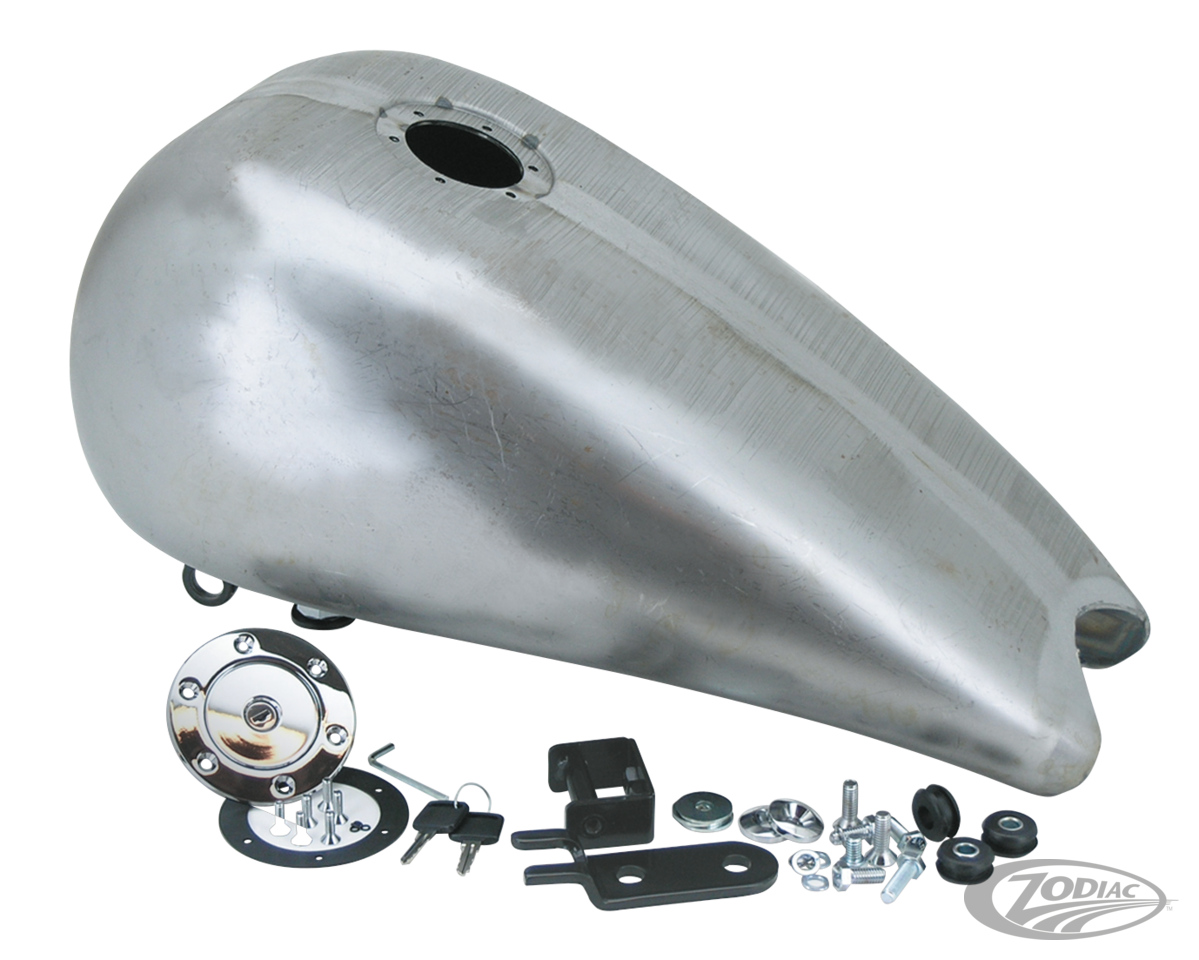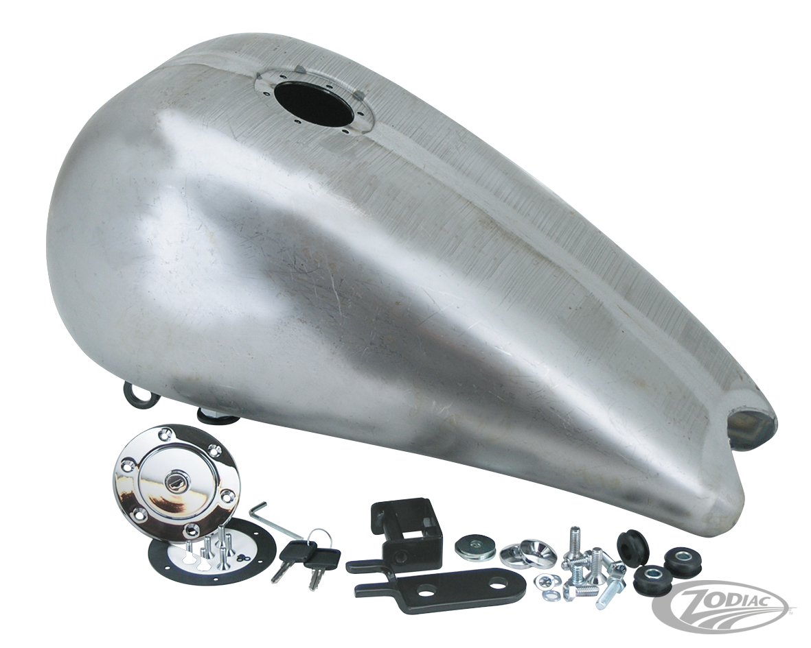 This one-piece 3" stretched gas tank has a smooth top and includes a single midi aero locking gas cap. This tank gives your bike the same kind of styling as with the aluminum gas tanks, but at a much more economical price. The rear of the tank has a cut-out to match with most narrow seats. Tank holds approx. 3.8 gallon (14,4L.)