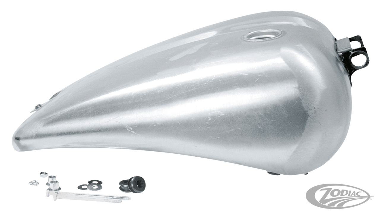 This one piece stretched smooth top gas tank will give your Dyna Glide the long, slippery stretched look and flowing lines associated with Low Rider Custom bikes. The stretched section is not a weld-on part but an integral part of the tank and has a seat cut out to match with most narrow seats, such as our Silhouette seat. Tank holds approx. 4.2 gallon of fuel (15,9L.) and is available with Screw-In type gas caps, Quick Cam lock gas caps, single Aero-style gas cap and with the new Pop-Up gas caps in a paintable and chrome version. Fits 1991 thru 2005 carburetor equipped Dyna.
