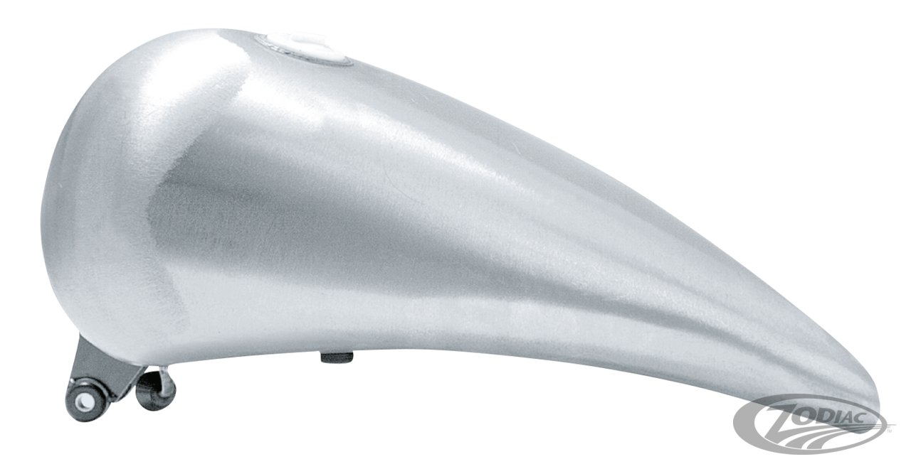 This one piece stretched gas tank will give your Softail the long, slippery stretched look associated with the top Custom bike builders. The stretched section is not a weld-on piece but an integral part of the tank. The exclusive Zodiac stretched tanks are the only one piece steel tank available. Its design will give your bike smooth, flowing lines and a very classy look. Stretched Softail tanks are available with dual and single screw type gas cap, dual or single, "Quick-Lock" lockable gas cap as well as a tank with a single cap aircraft style Aero gas gap and with the latest style Pop-Up gas cap in a paintable or chrome finish. Due to the sleek design a narrow seat (like our Silhouette seats) must be used, it can't be used with the stock seat. Fits Softail models 1984 thru 1999. Tanks hold approx. 4.2 gallon fuel (15,9L.).