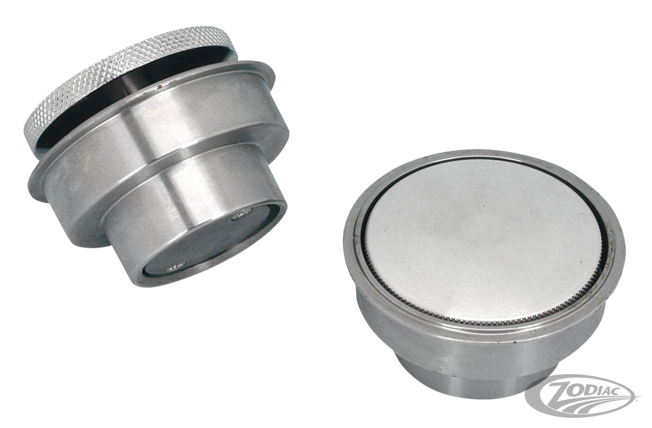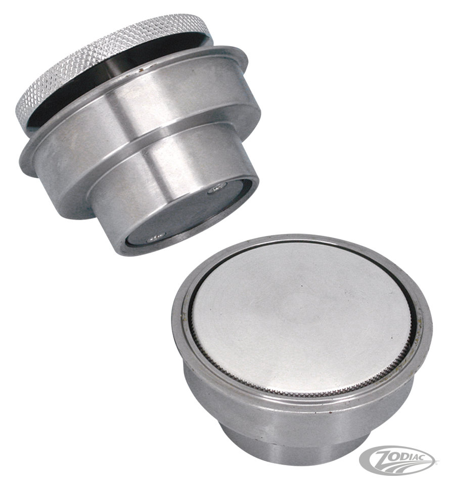 These "Pop-Up" gas caps allow you to give your gas tank that real Custom Smooth Top look, as seen by the worlds leading Custom Bike Builders. They are easy to open or close, just push in the cap, twist and the cap will pop up and is ready to unscrew. No matter if you have a steel or aluminum gas tank, Zodiac has these Custom goodies with your choice of aluminum or steel weld-in bung. Caps are vented and available in aluminum with a top-quality show chrome finish, polished Stainless Steel, or natural aluminum to apply the finish of your choice. Bungs have a 2 5/16" (59mm) outer diameter, caps are 55mm in diameter.