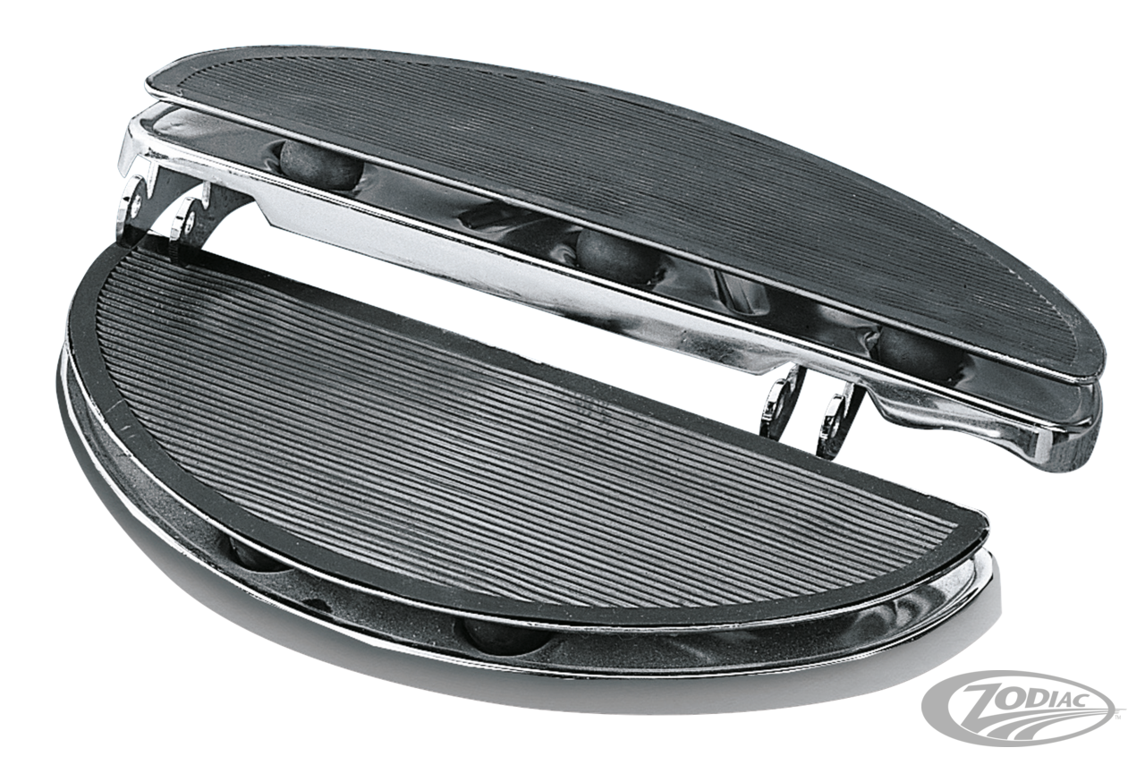 Driver floorboards fit: •1980 to present Touring (except FLHTCUL, FLHTKL & FLHTCUL-TC) •2009 to present Trike •1986-2017 FL Softail models •2012-2016 FLD Switchback, Oval shaker floor board set (OEM 50599-89T)