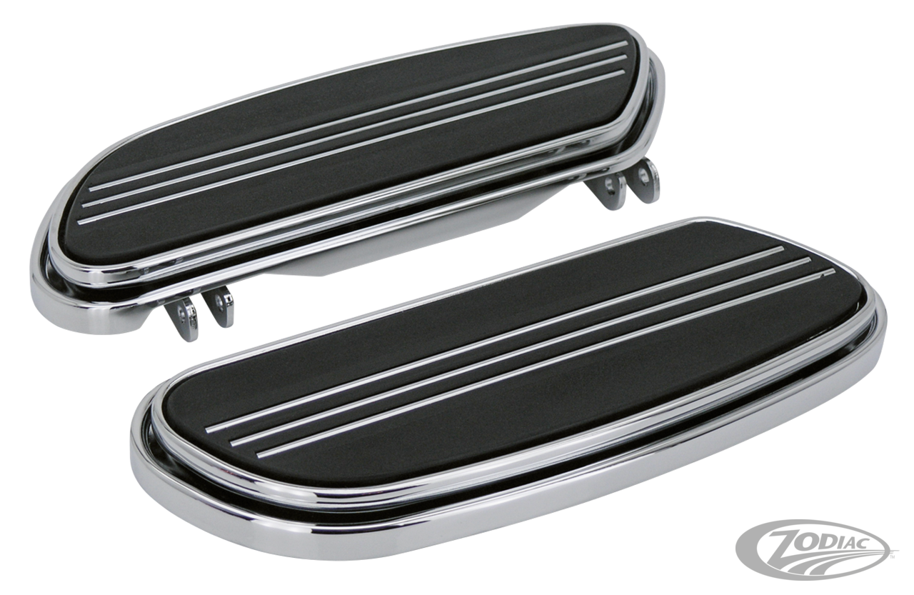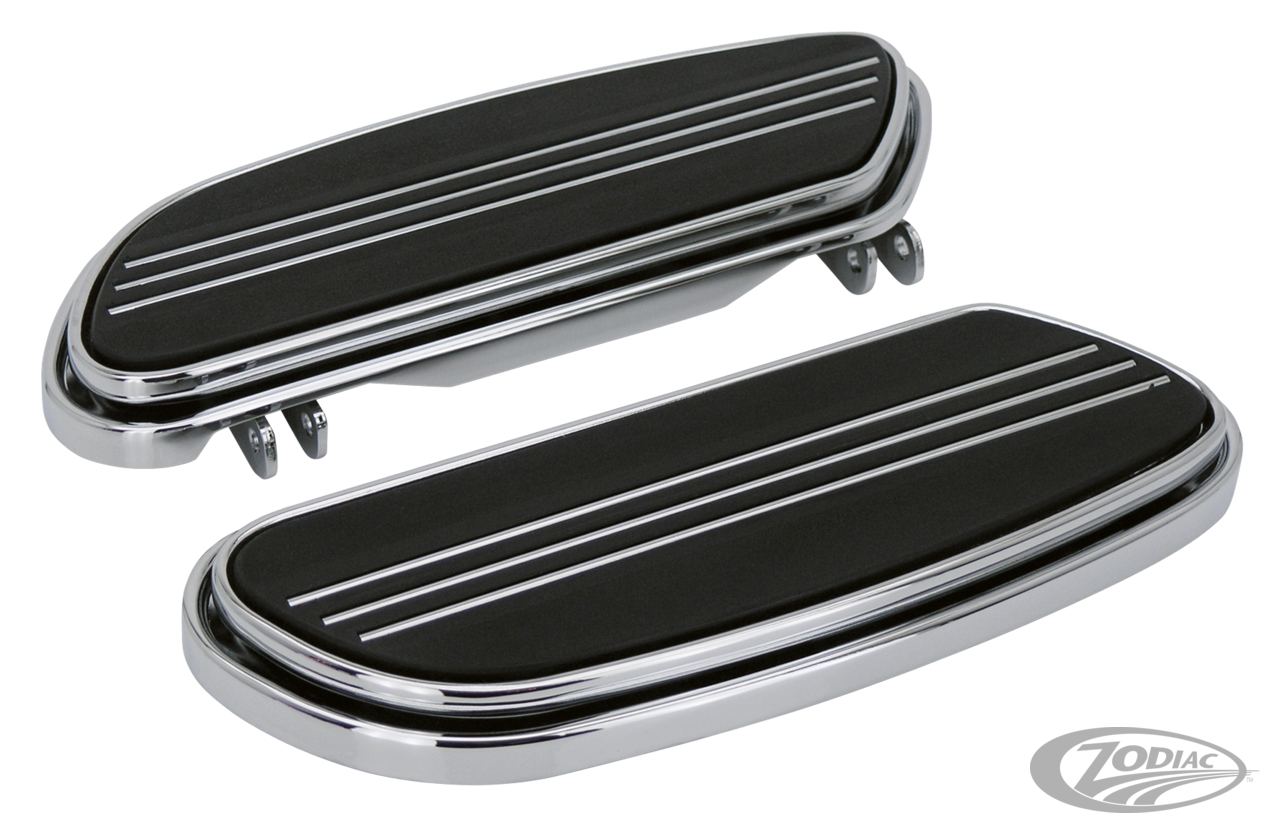 The Swept Streamliner floorboards are styled after the sleek sweeping floorboard design found on the FLHRC Road King Custom. These boards feature rubber pads to isolate vibration and three chrome bands to enhance their appearance. Sold in pairs in your choice of black or chrome.