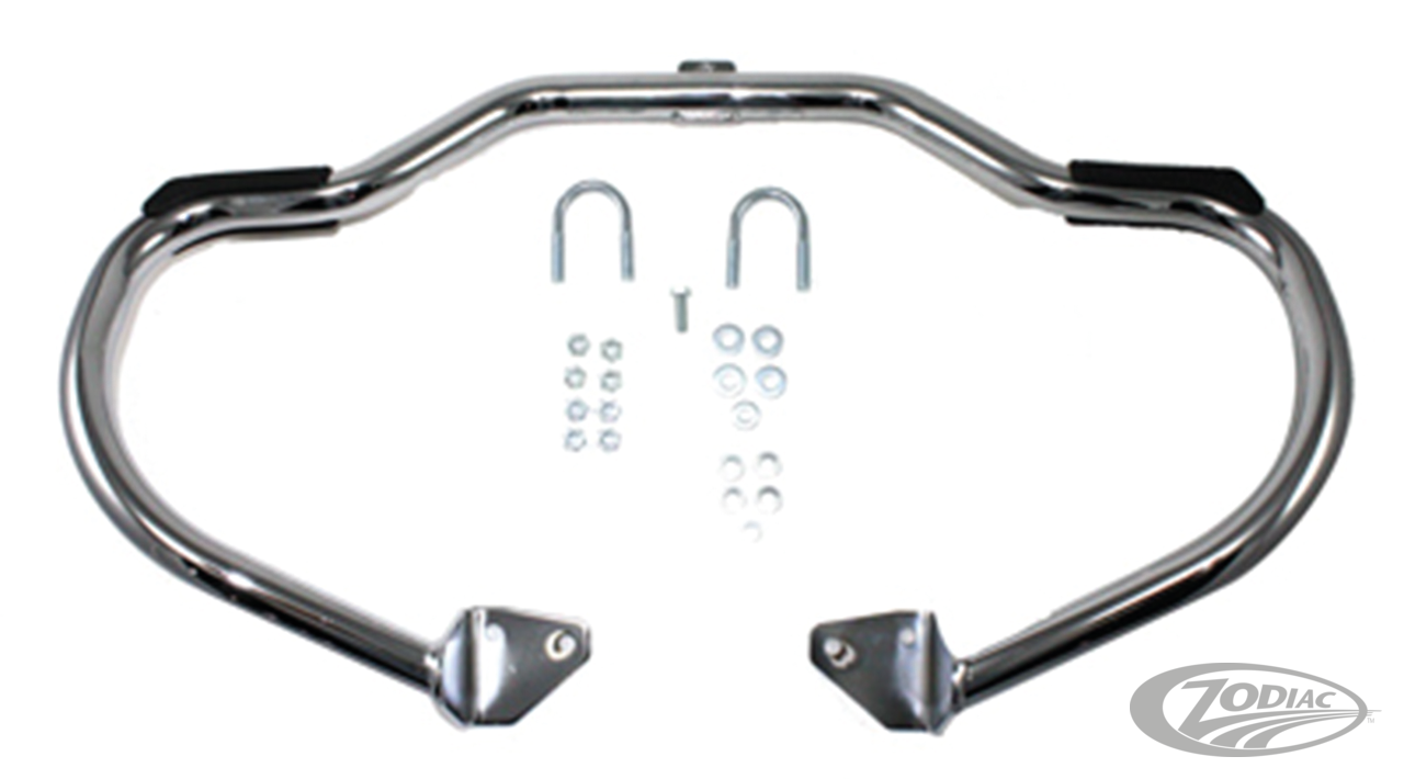 These heavy gauge highway bars are 1 1/4" (32mm) in diameter and feature mandrel bends, a show chrome or black finish and footrest rubbers.