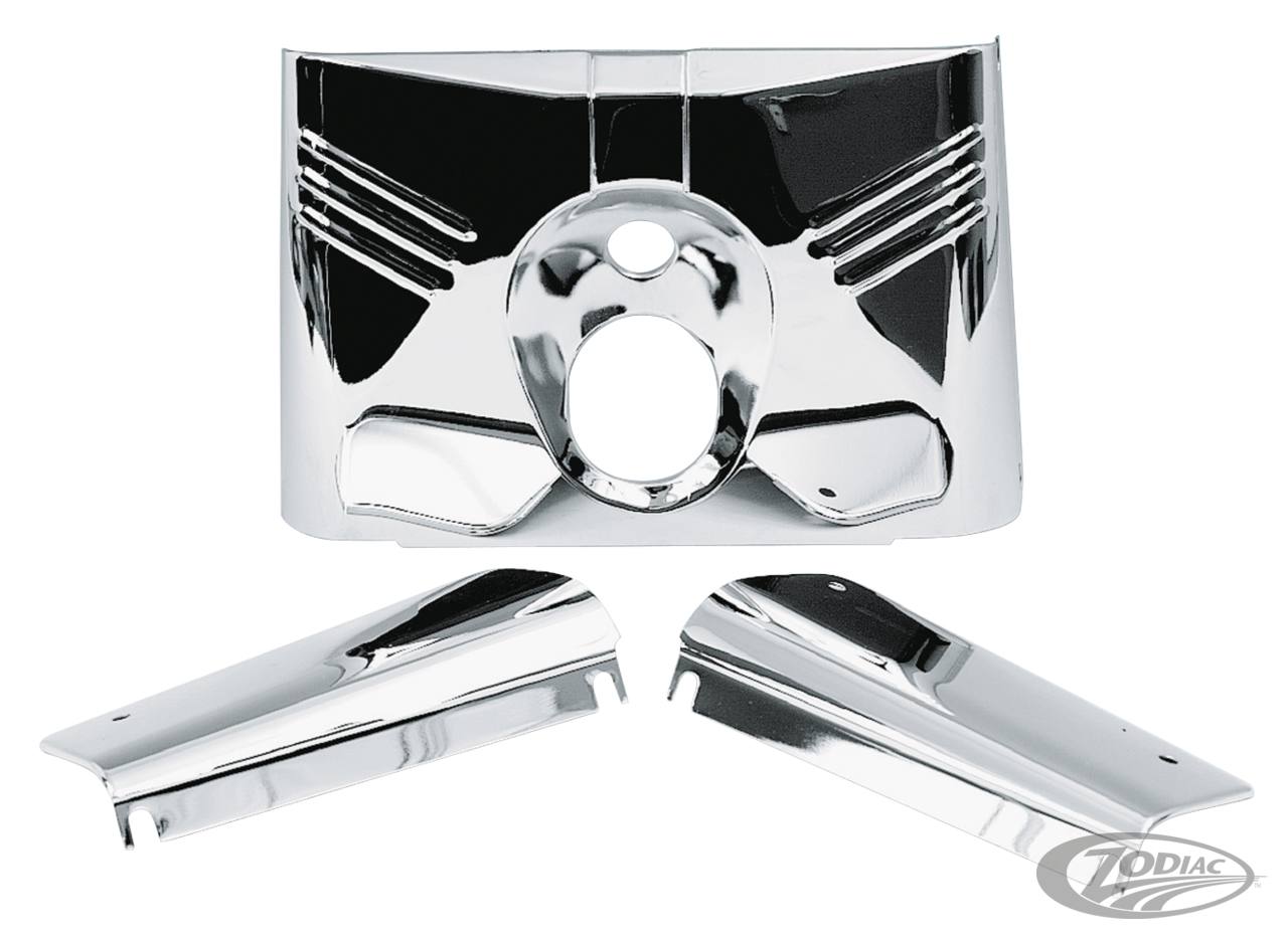 Fork cover kits replace the stock satin fork covers on FL Softail and are available with the three ribs left and right of your headlight, like stock, or completely smooth. Use stock hardware or order hardware kit separately.