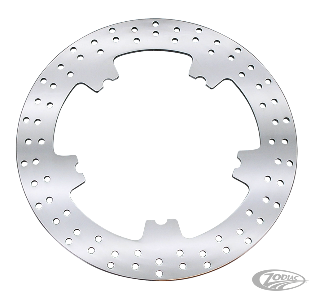 Stainless steel disc brake rotor as found on single disc 2006 thru 2017 FXD Dyna, FXDL Low Rider, FLD Switchback with cast wheels, V-Rod 2006 thru 2017 and selected 2009 to present CVO Touring models. Disc is 300mm in diameter. Bolts straight onto the stock cast aluminum front wheel.
