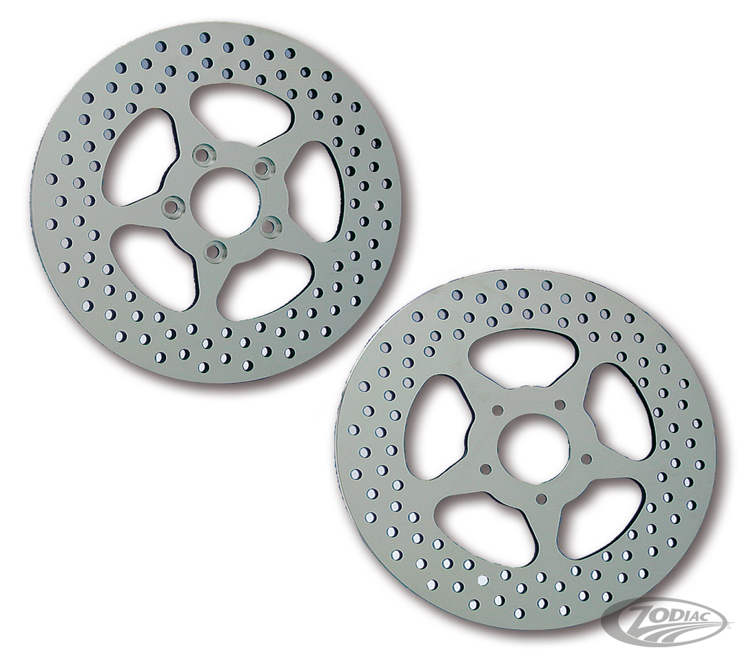 Special High Quality stainless steel disc brake rotors for Harley-Davidson. Fits models from 2000 to present. The polished rotors are surface induction hardened with a 12-14% chrome content for superior wear characteristics on #420 steel plate. These disc brake rotors are precision-ground for trueness and are interchangeable with OEM discs. These mirror shine polished rotors look great on both OEM as well on any of our aluminum Custom wheels. Also check out our chrome plated hardware sets for mounting these discs. Note: Front disc rotors with 5/16" counterbore mounting holes can also be used for rear application when mounting holes are drilled to 3/8".