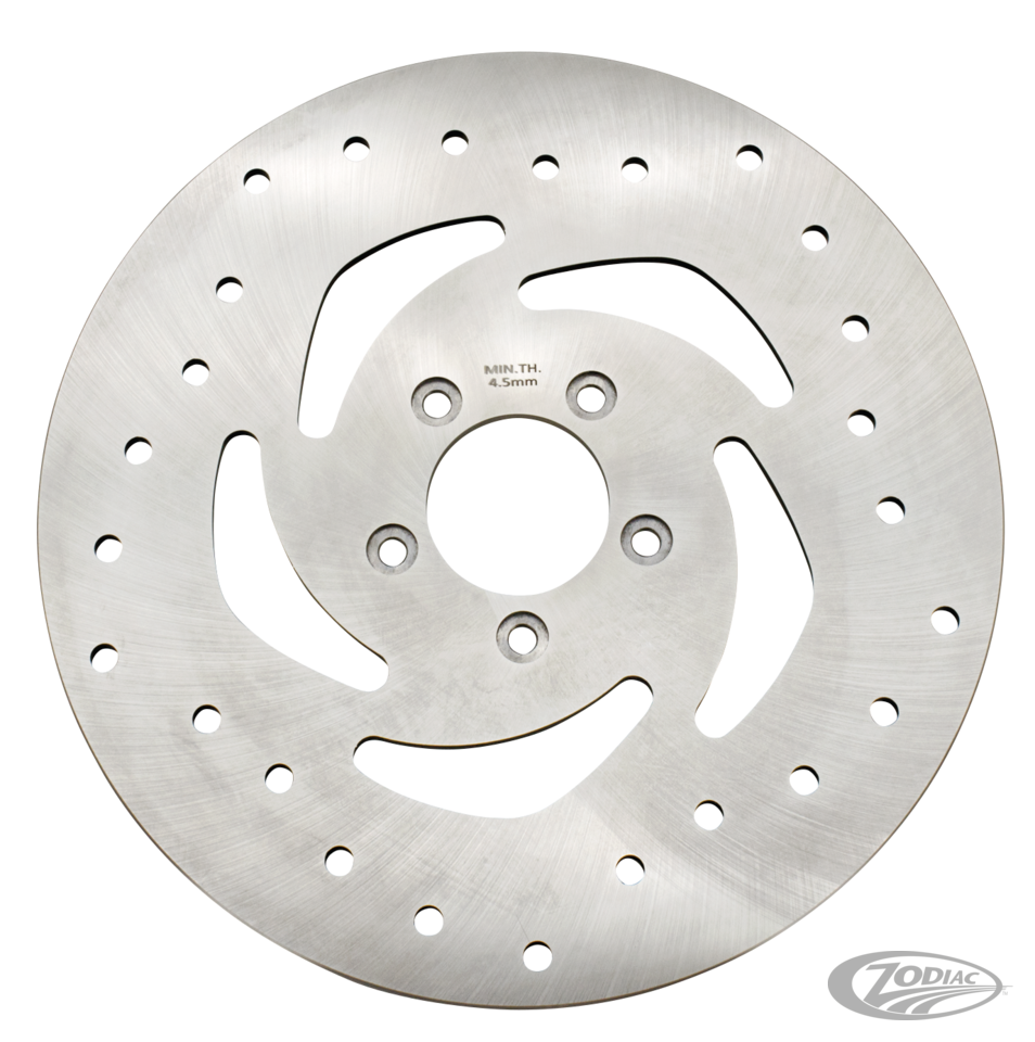 Fits single disc hub mounted front on 2006-2017 Dyna, 2014-2022 XL Sportster and 2015 to present SoftailRotor has 11.8" (300mm) outer and 2.22" (56.4mm) inner diameter and 5/16" counterbore mounting holes, Left front brake disc, machined finish (OEM 41500022)