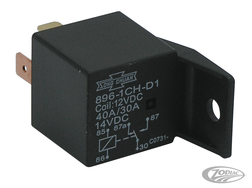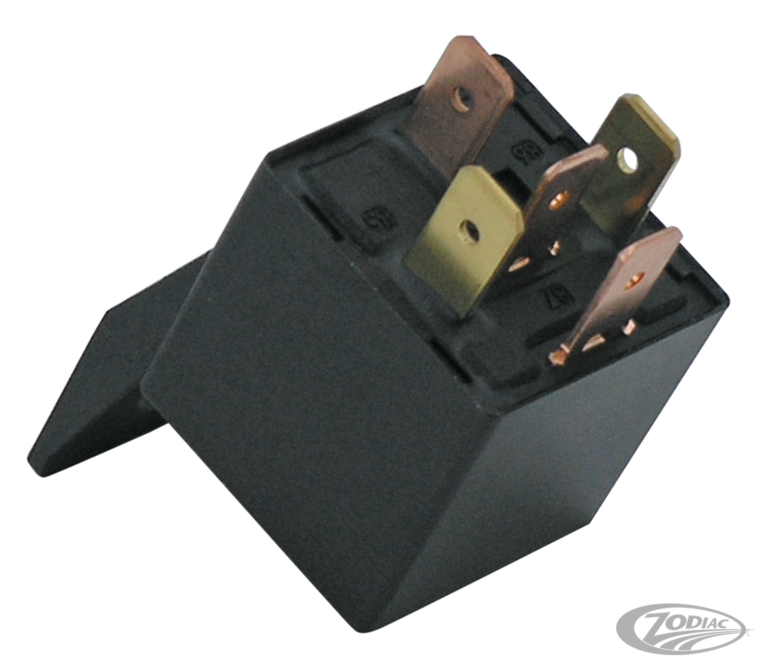 A Bosch style relay for 12 Volt systems. Can be used for many applications, for example to control your headlight with a single wire and a push button switch. Capable to switch up to 40 Amps.
