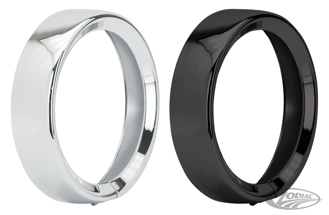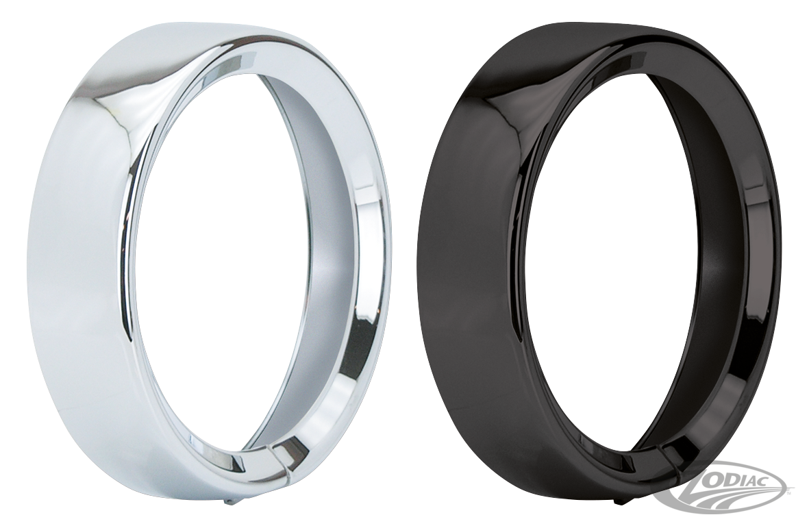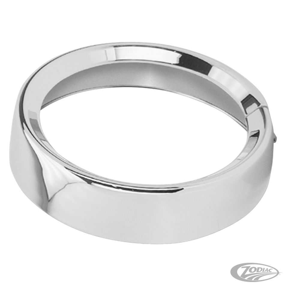 This chrome plated headlamp trim ring is longer than the stock trim ring, adding that extended, beefy look to your headlamp. Fits over the stock headlight trim.