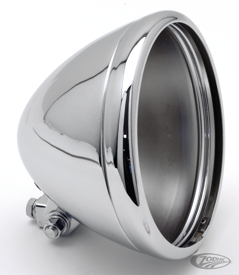 An updated version of the original headlight used on all models from 1936 thru 1954. Fits all FXWG and Softail models from 1980 to present, as well as any Custom application where a bottom mount headlight can be used. Comes with a 12 Volt 55/100 Watt halogen bulb and all necessary hardware.