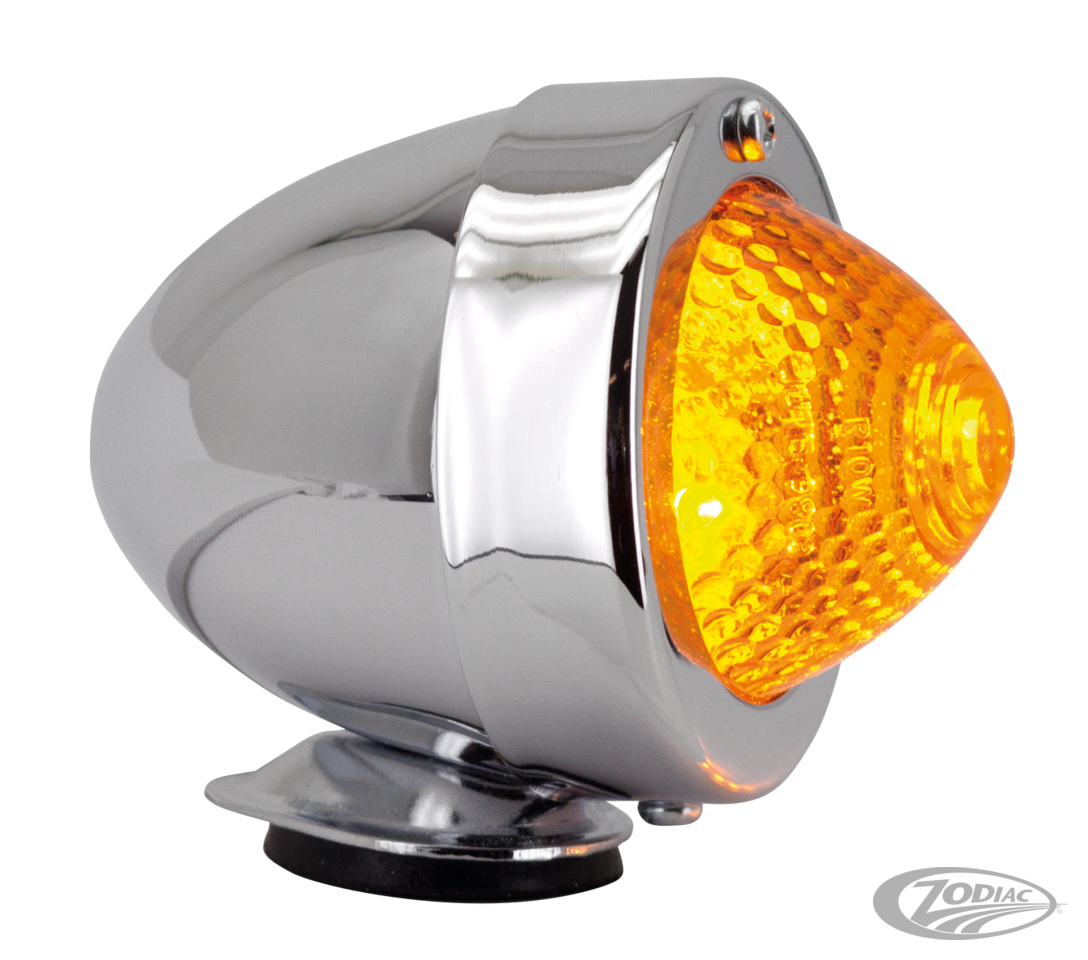 These EC approved chrome plated Bullet lights feature the latest "Honeycomb" amber acrylic lenses. Lights come with single filament 12 Volt 10 Watt bulb and are pre-wired. These Bullet marker lights can be used as running light or turn signal and are available with 1/4" short or 3/4" long stud. Sold each.